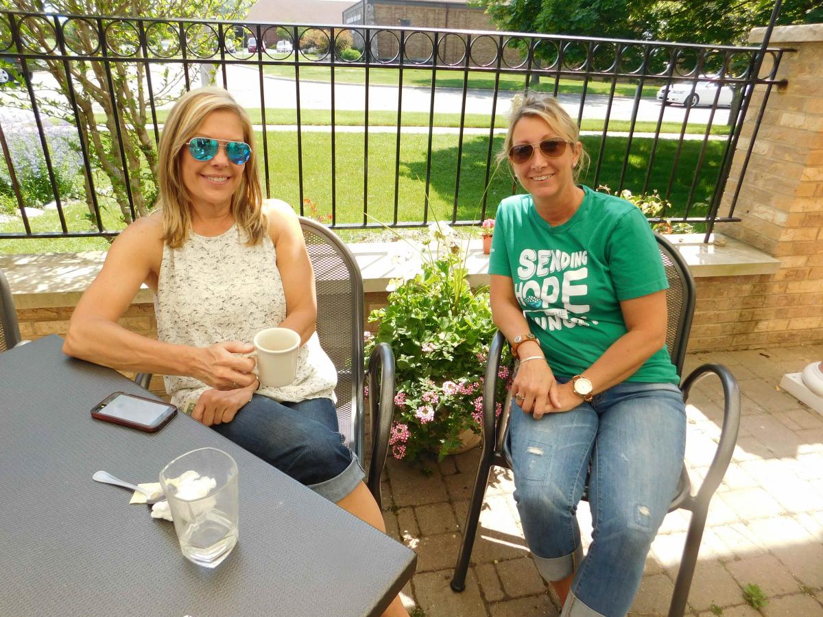 Friends enjoying breakfast on the patio at Downer's Delight in Downers Grove