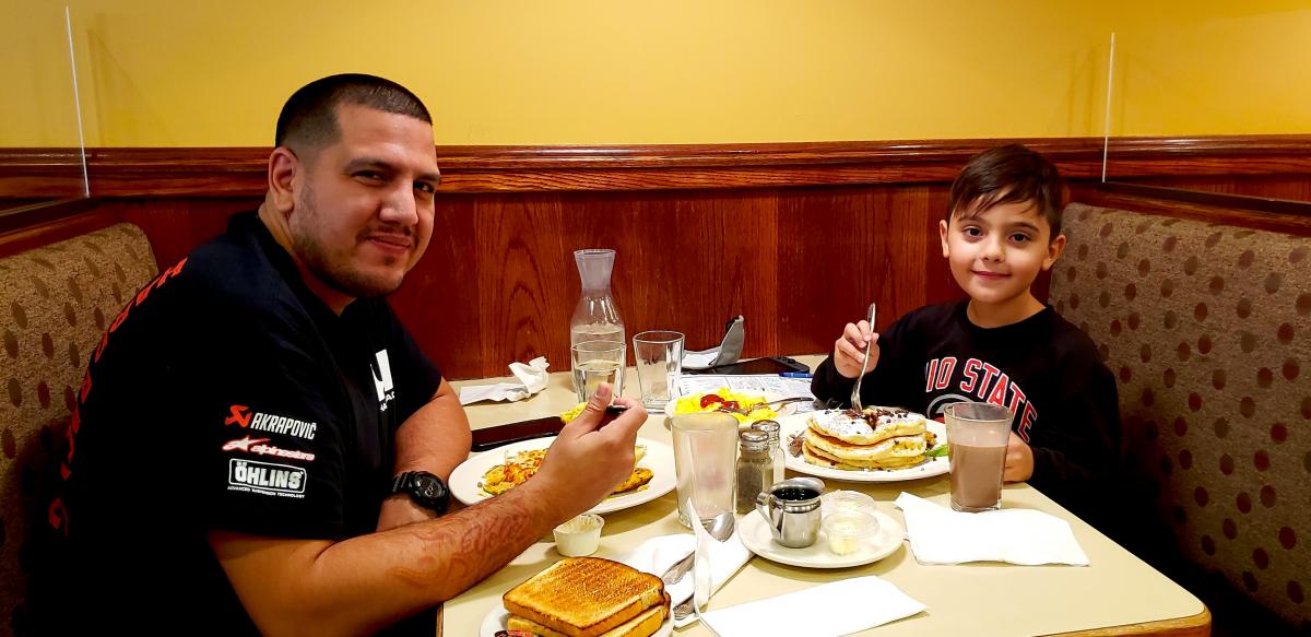 Father and son enjoying breakfast at Annie's Pancake House in Skokie