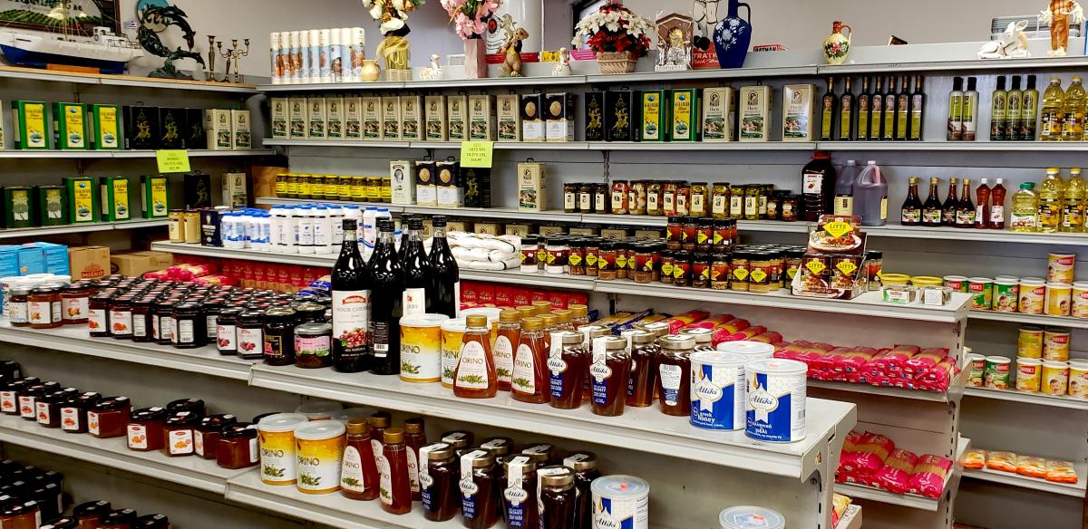 Nice selection of Greek honey and olive oil at Brillakis Foods in Niles