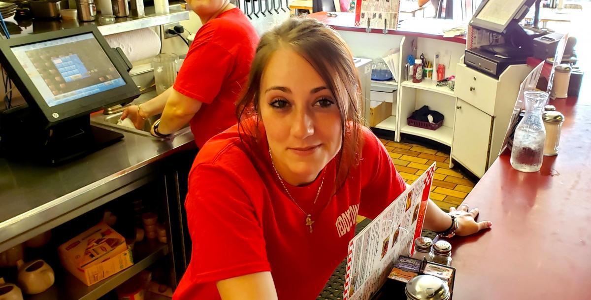 Friendly server at Niko's Red Mill Tavern in Woodstock