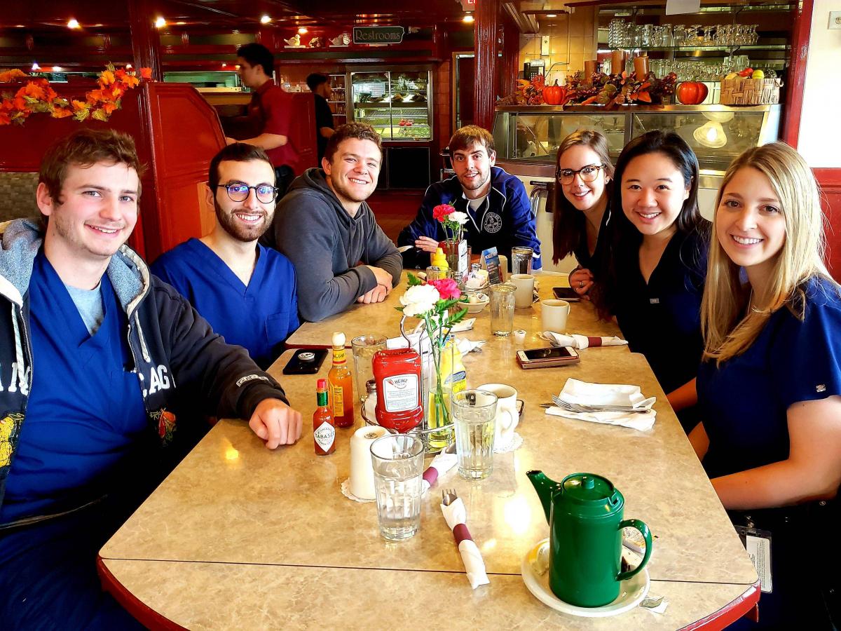 Friends enjoying breakfast at Omega Restaurant & Pancake House in Downers Grove