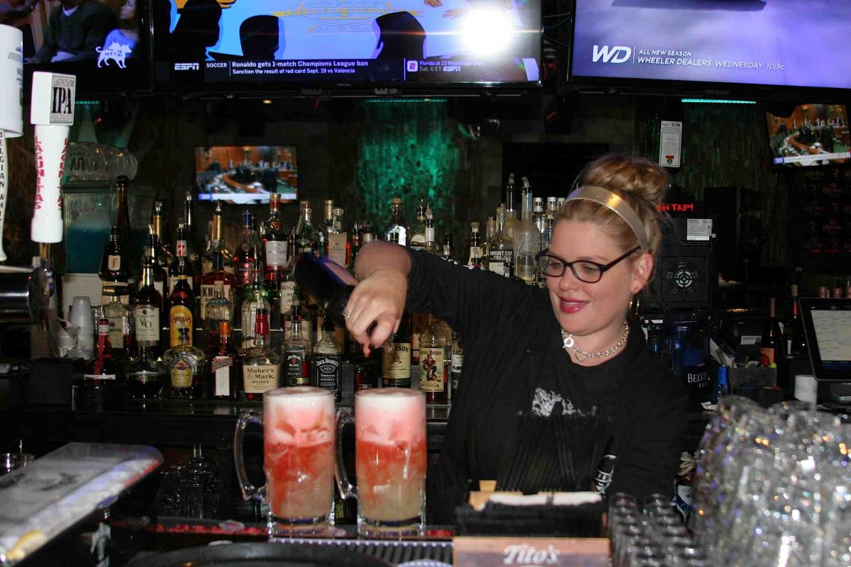 Friendly bar server preparing "Slammers" at Rocky's American Grill in Prospect Heights