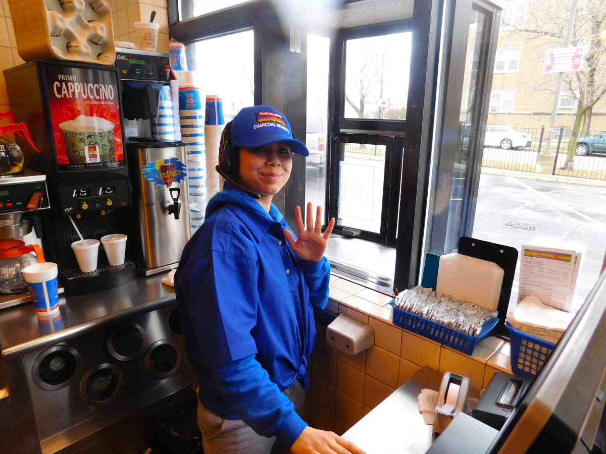 Friendly drive-thru worker at Charcoal Delights Restaurant in Chicago
