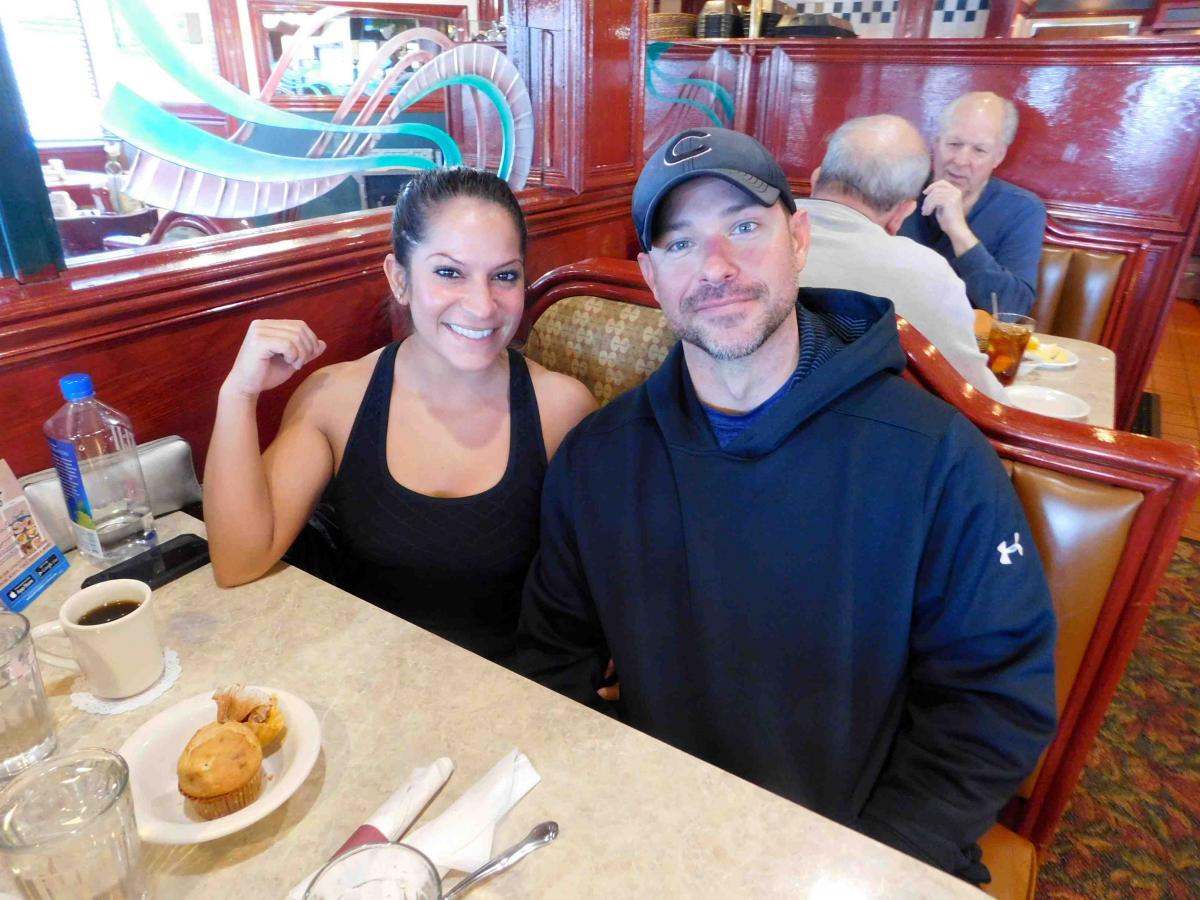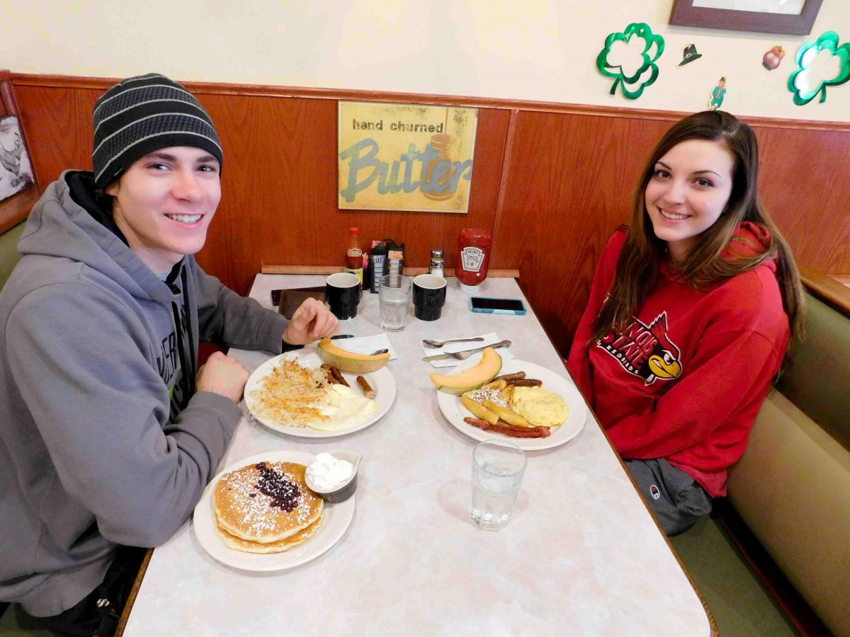 Couple enjoying breakfast at Omega Restaurant & Pancake House in Downers Grove
