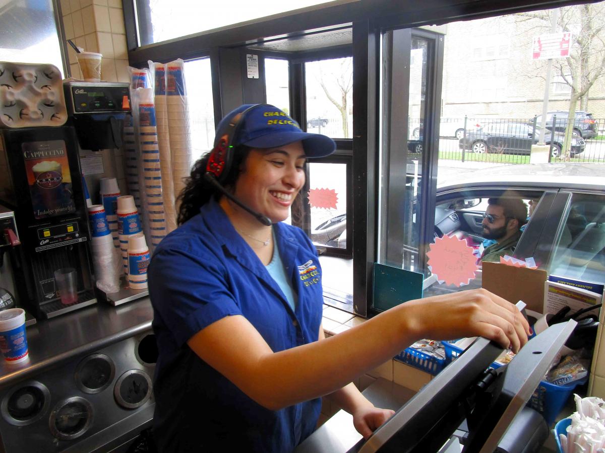 Friendly drive-thru worker at Charcoal Delights Restaurant in Chicago