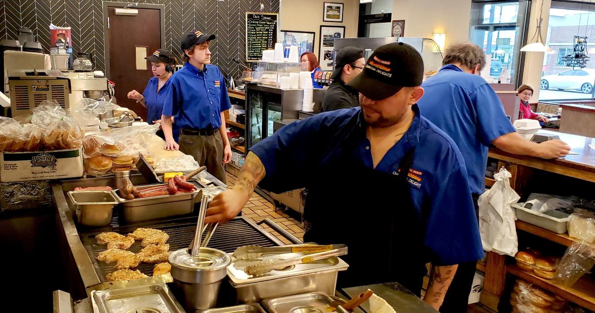 Busy kitchen crew at Charcoal Delights Restaurant in Chicago