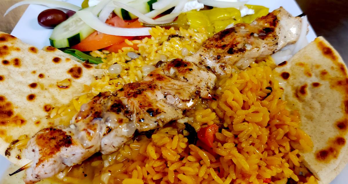 The famous Chicken Souvlaki at Rose Garden Cafe Elk Grove Village